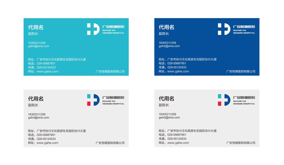 品牌字体设计部分为黑灰色,黑灰色有着严肃规整的色彩属性,象征着正规化医院医疗服务的权威性。标志整体以前卫的,现代的设计语言,诠释了广安恒德医院的现代化气息,简洁大方的图形拥有较强的可塑性为后期的品牌延展留下无限空间。