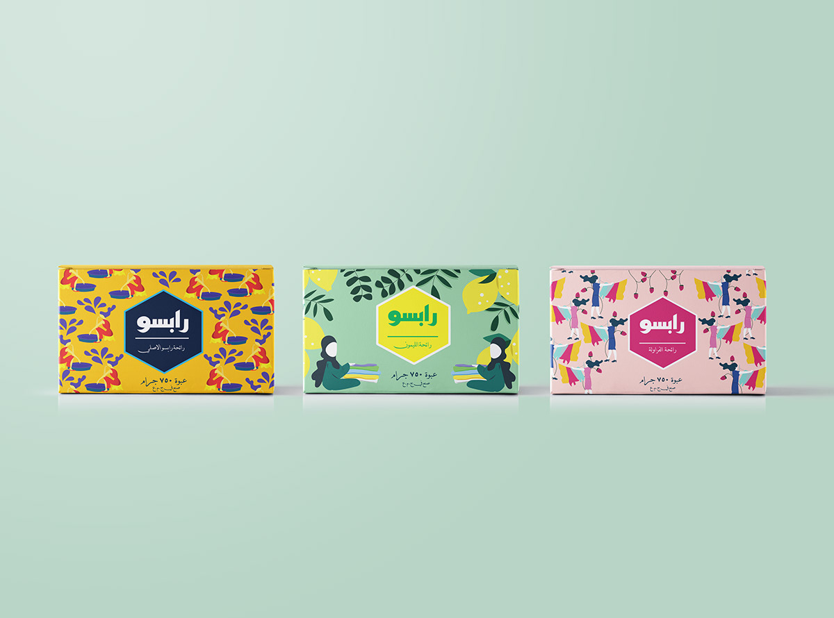拉普索是上个世纪50年代以来埃及的一种旧洗涤剂品牌。我们的品牌本质基于这样的观点:洗洁精的包装可以是五颜六色的、现代的和快乐的,有三种不同的插图图案,每一幅插图都代表了埃及妇女的气味,以及她们洗衣服时所付出的努力。Rapso的阿拉伯字体设计也是受旧版设计的启发,因为它是该品牌最值得纪念的东西之一但我试图使它现代化,使它更切合时代的需要。