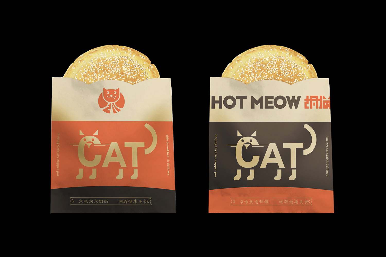 小吃和饮品属于附属产品,主要用于个人消费,其食材健康无添加,创新了传统北京小吃的口味和样式,胡同猫整体风格虽然是复古、淡淡的怀旧、北京胡同风格,但是考虑到消费群的偏年轻化,设计团队试图在包装上融入清新,时尚,有趣的视觉感,最终设计了以猫和英文字母CAT结合的图形符号。