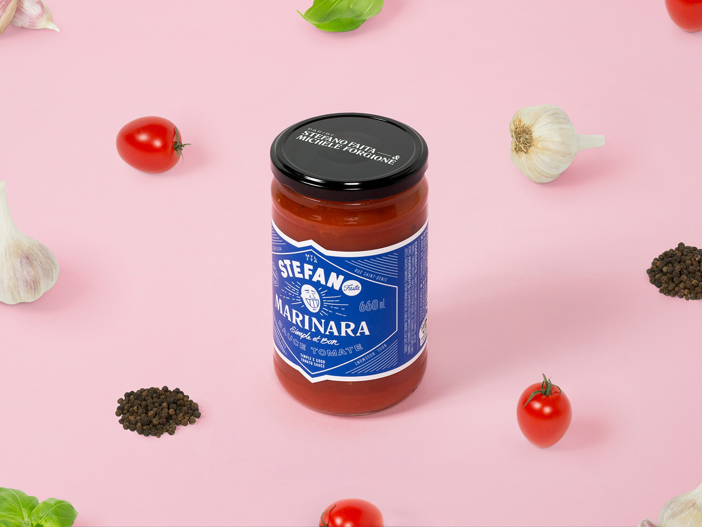 -在 Donea 和米歇尔 Forgione 的杂货店里, 创建第一套即食产品的品牌标识和包装。四罐装番茄酱 (西红柿和罗勒、大蒜、arrabiata 和露水) 以一种不寻常的图形方式在片剂中脱颖而出。