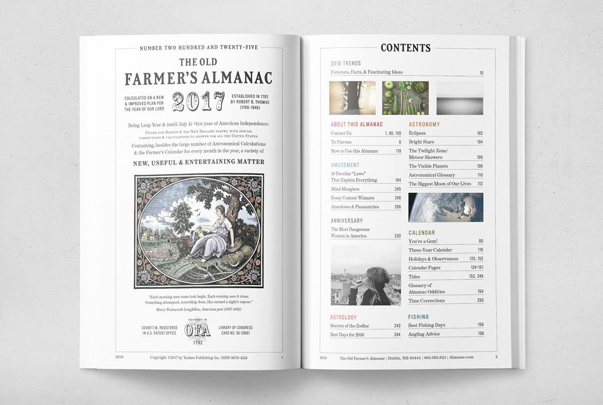 《老农民年鉴》自1792年以来一直持续出版,成为北美最古老的出版物。我们很荣幸重新设计了老农的年鉴。有了忠实的追随者和几个世纪的历史,我们的目标是重振最初的设计。通过忠实于历史的准确性和18世纪的版式,我们重新设计了今天的年鉴设计,将永恒的设计带到了最前沿。我们与字体局合作,与Steven Noble合作,重新绘制封面插图。我们直接与老农的Almanac合作,重新设计了目前正在推出的标志和视觉系统,希望它能再出版225年。